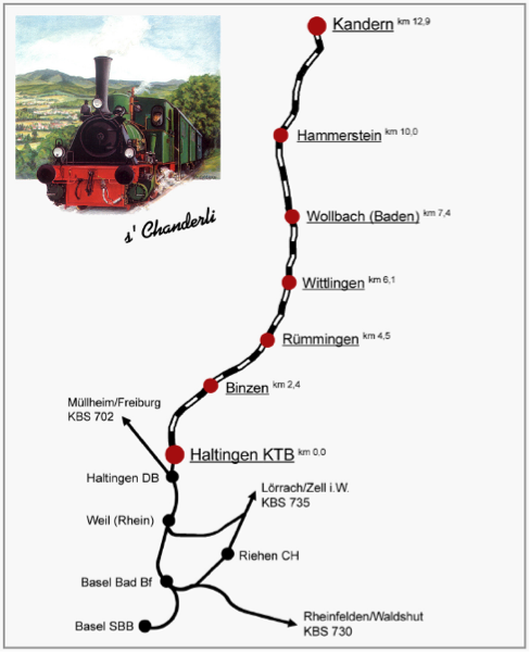 Cette année nous vous invitons à la découverte du Kandertalbahn. Cette petite ligne secondaire ne connaît plus de trafic régulier depuis 1983. D’une longueur de 12,9 km, elle est située tout au Sud du Länder allemand de Baden Württemberg, à 6 km seulement de la frontière helvétique.